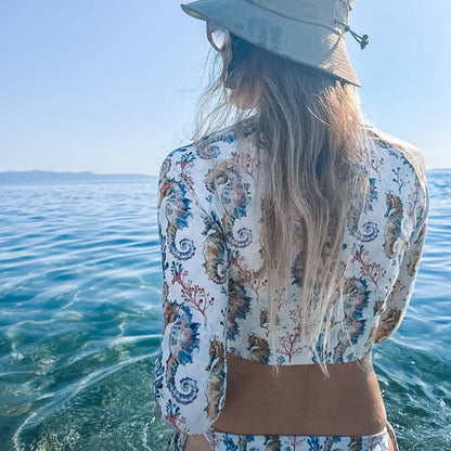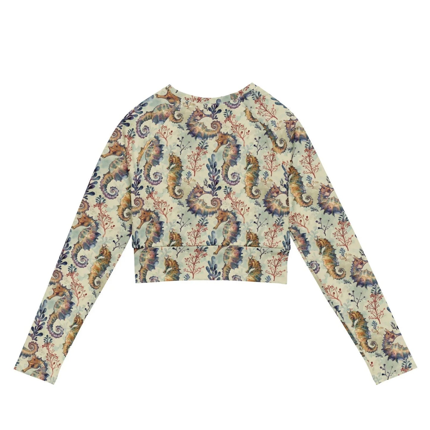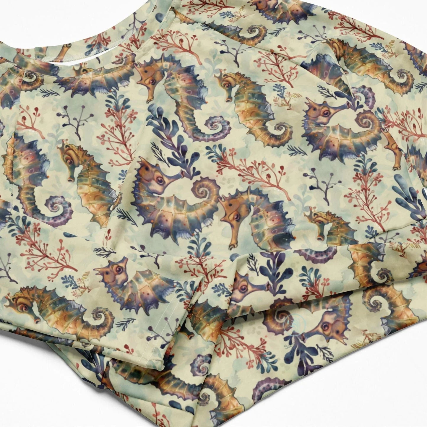 Whether you're hitting the waves or relaxing at the beach, our Seahorse Haven EcoWave Cropped Rash Guard is designed to keep you comfortable and stylish. Available in this seahorse pattern, each top adds a touch of underwater artistry to your wardrobe.